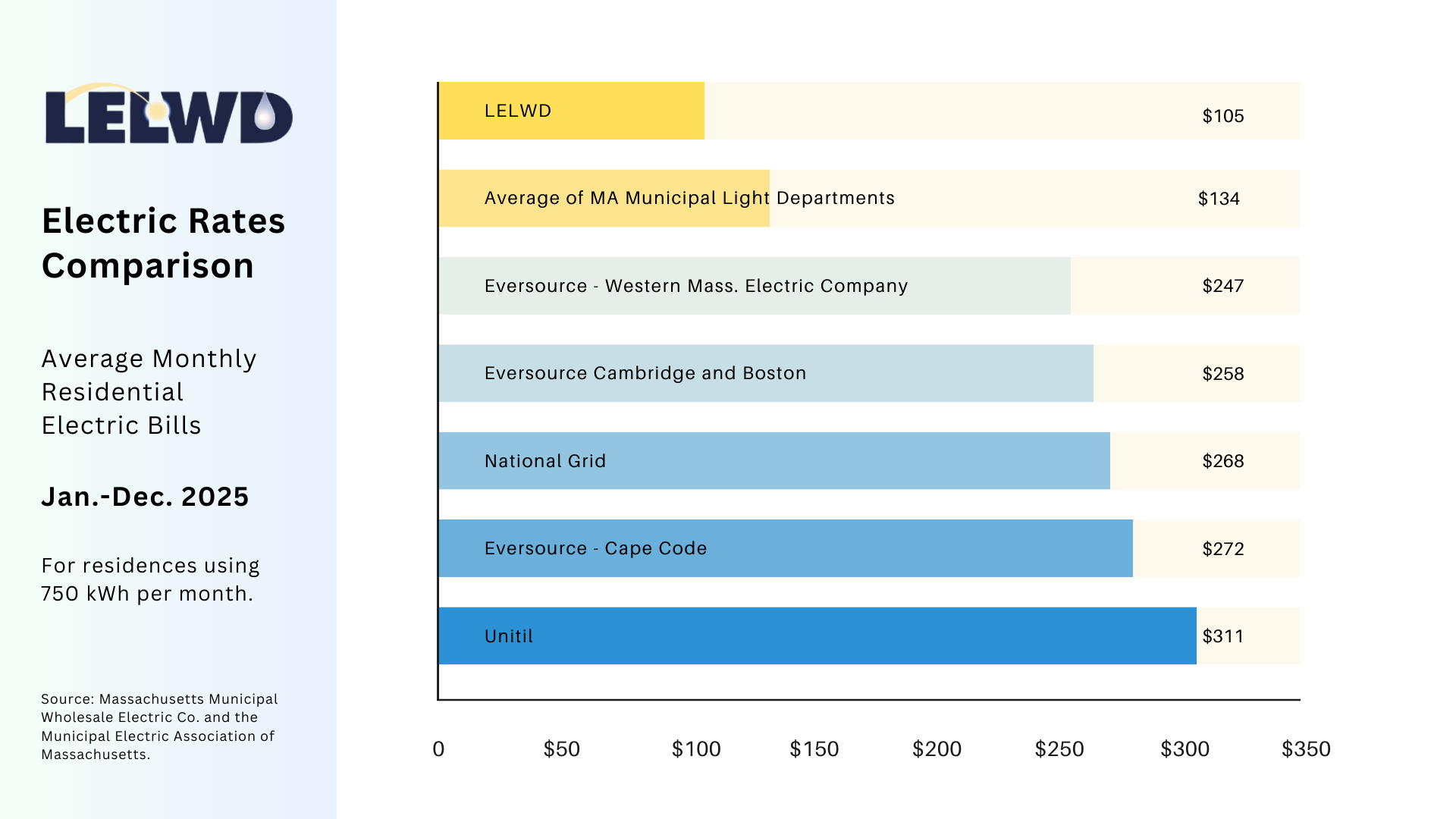In 2025, LELD continued to offer among the lowest residential electric rates in the state, according to a 12-month comparison to other utilities. As a municipal electric light department, we are able to secure low-cost electricity, which benefits the residents and businesses in Littleton and Boxborough.