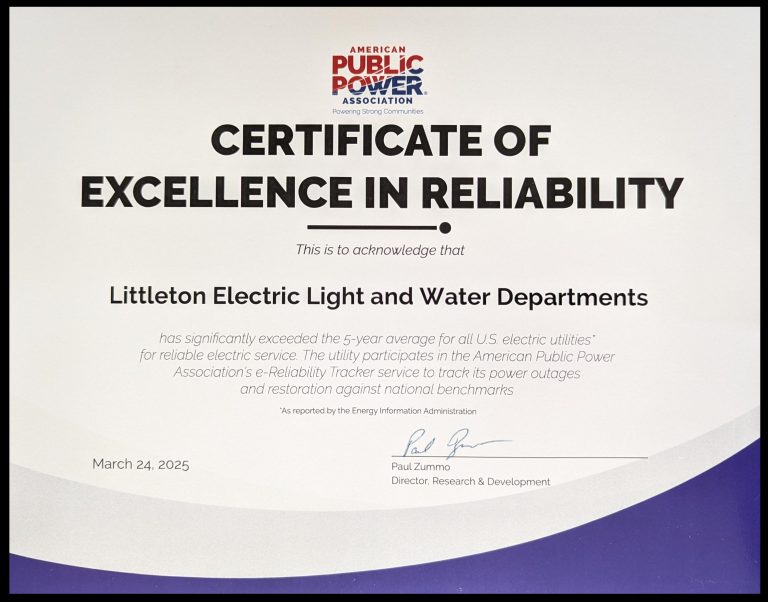 Littleton Electric Light Department is recognized as a Reliable Public Power Provider, based on reliability, safety, workforce development, and system improvement. LELD is also recognized as a Smart Energy Provider. This recognition is based on energy efficiency and distributed energy resources, environmental and sustainability programs, communication/education, and smart energy information. The American Public Power Association (APPA) is a trade group in Washington, D.C., that represents more than 2,000 not-for-profit, community-owned electric utilities, such as LELD.