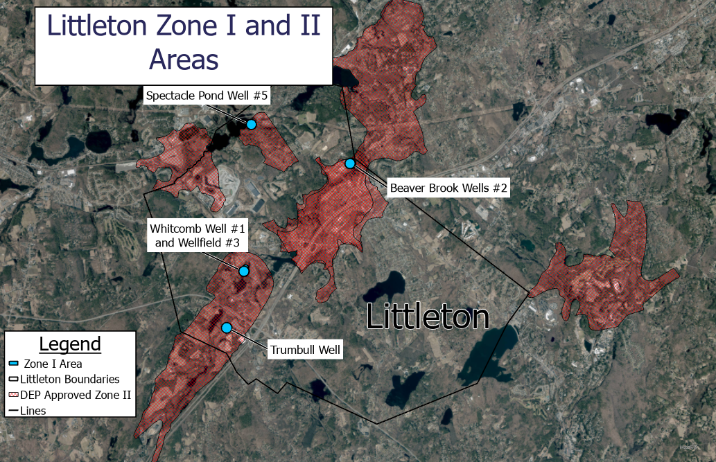 Littleton’s groundwater wells are protected by Zones I, II, and III. The zones surround the wells, with Zone I the most restrictive. Zone I is a defined distance from the water source, and Zones II and III are set by the area’s impact on the aquifer. (See the map for Zone I and II locations.)