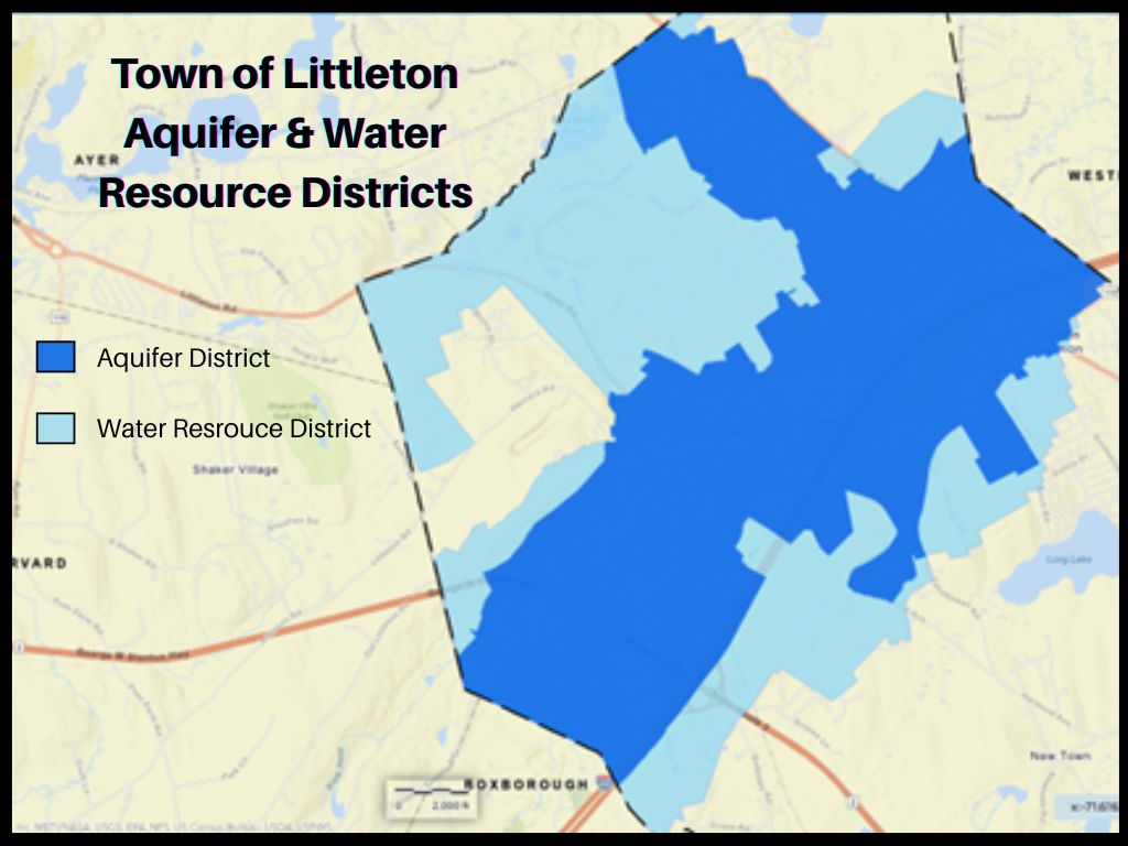 Zone II: Not a fixed radius, Zone II is the area that will transmit groundwater to the wells when there is no precipitation recharge for three months. Littleton’s bylaws establish an Aquifer District to restrict allowable uses in order to protect groundwater. The Aquifer District encompasses the Zone II areas. (The Aquifer District is shown in dark blue on the nearby map.) The bylaw prohibits activities within the Aquifer District, including the storage of hazardous waste, road salt and treatments, petroleum products, chemicals and fertilizer. It also prohibits automobile sales, junkyards, landfills, truck terminals, and deep earth removal.